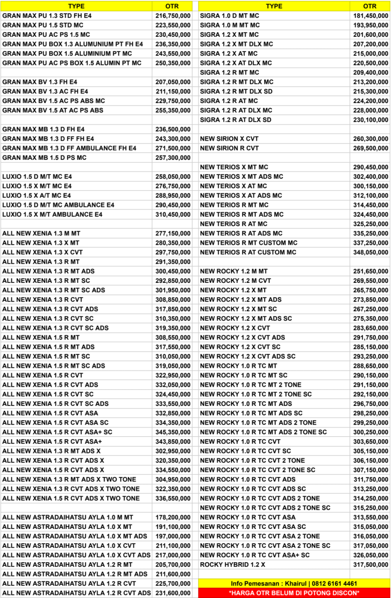 Hallo sahabat Astra Daihatsu Padang yang sedang mencari info tentang mobil Daihatsu di Sumatera Barat, baik tentang info promo, harga, test drive dan lain-lain. Dapatkan promo menarik diskon hingga puluhan juta dan harga paling murah. Kami menerima tukar tambah unit mobil lama dengan mobil baru. Pembelian mobil Daihatsu bisa dari rumah dengan saya bisa menghubungi saya pada nomor kontak 081261614461. Bonus aksesoris dan hadiah untuk program khusus pembelian mobil daihatsu di sini.